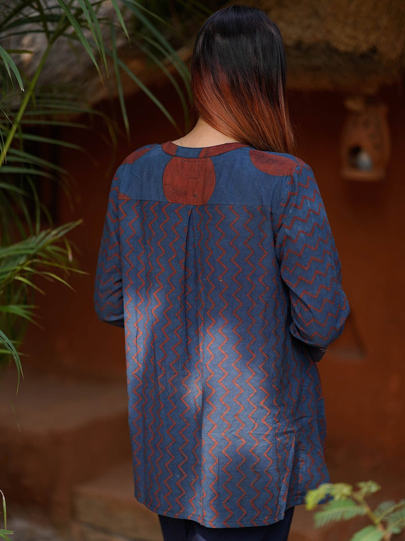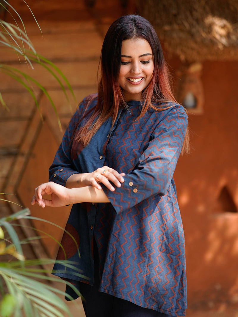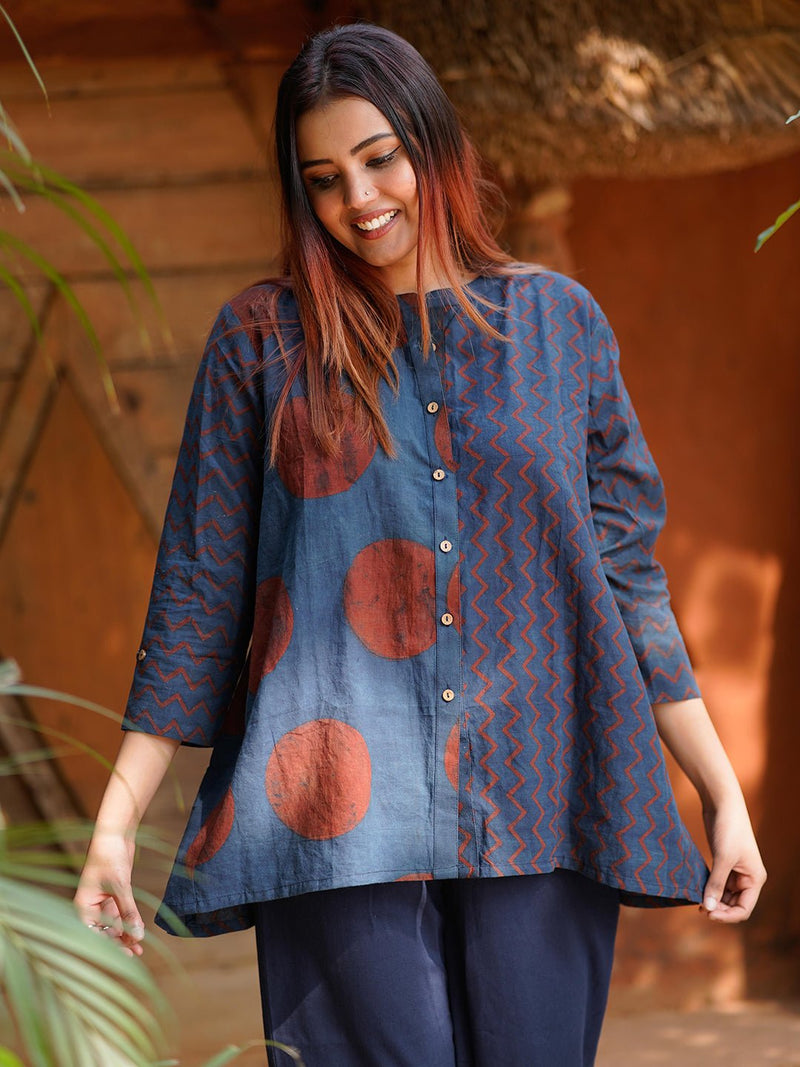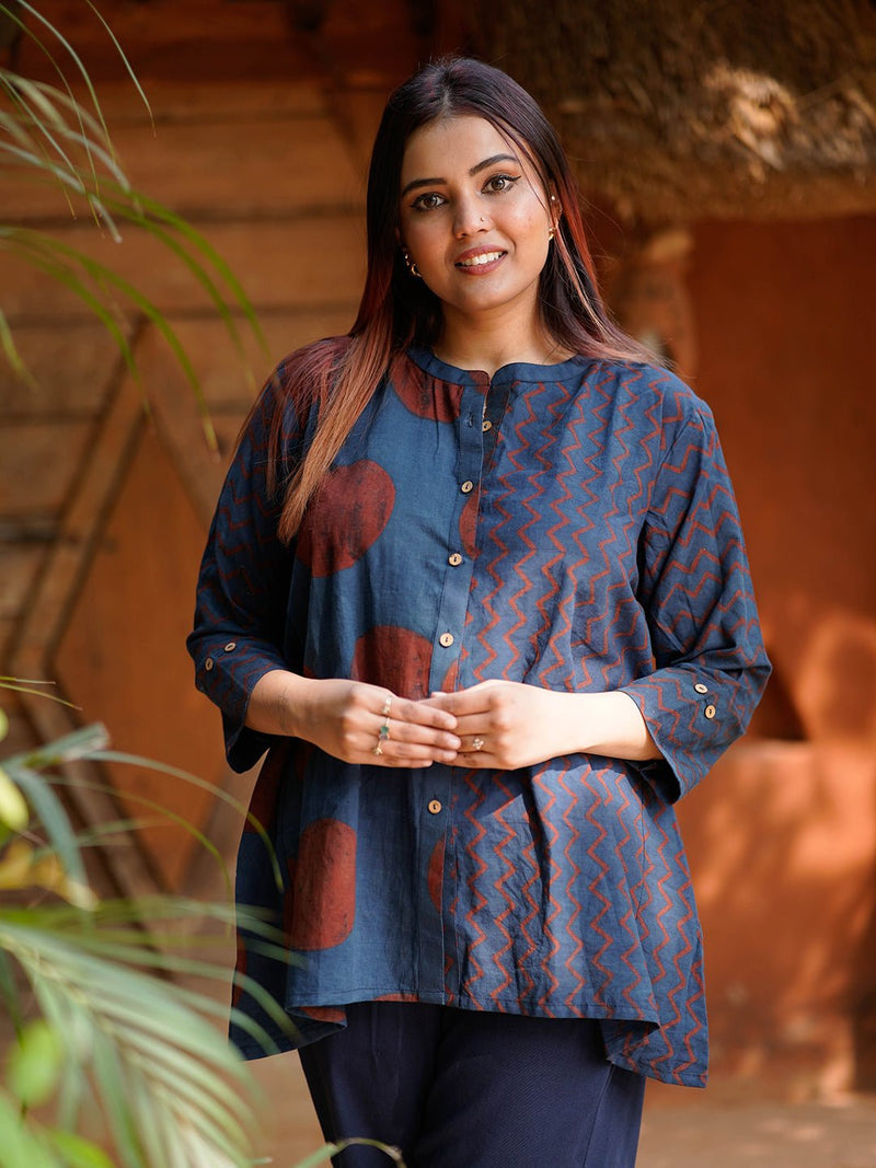Playful, free-flowing, and rooted in craft — the Maahi Top is your everyday rebellion against structure. Handcrafted using the ancient Ajrakh block printing technique, this top features bold natural-dyed indigo and madder motifs, combining geometric zigzags and polka dots into a striking asymmetric layout.